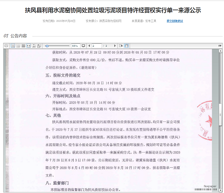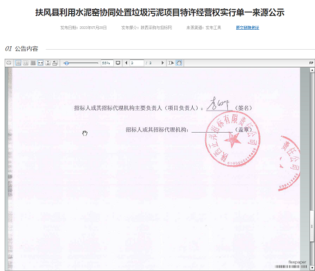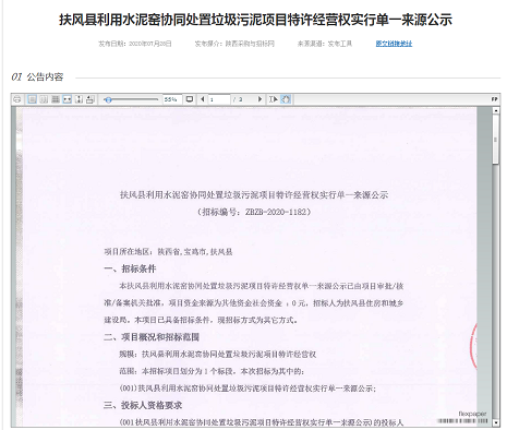 扶風縣利用水泥窯協同處置垃圾污泥項目特許經營權實行單一來源公示