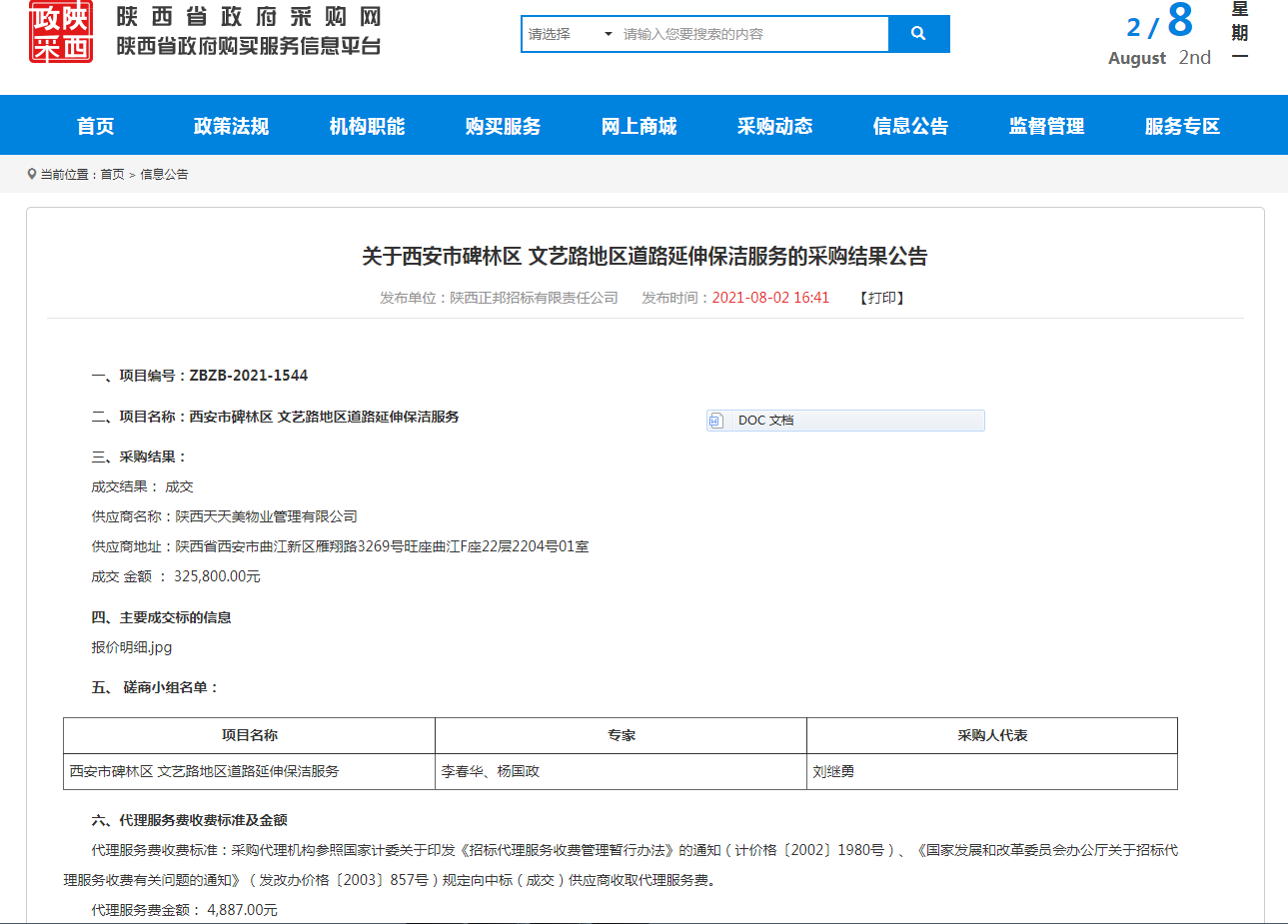 關于西安市碑林區 文藝路地區道路延伸保潔服務的采購結果公告