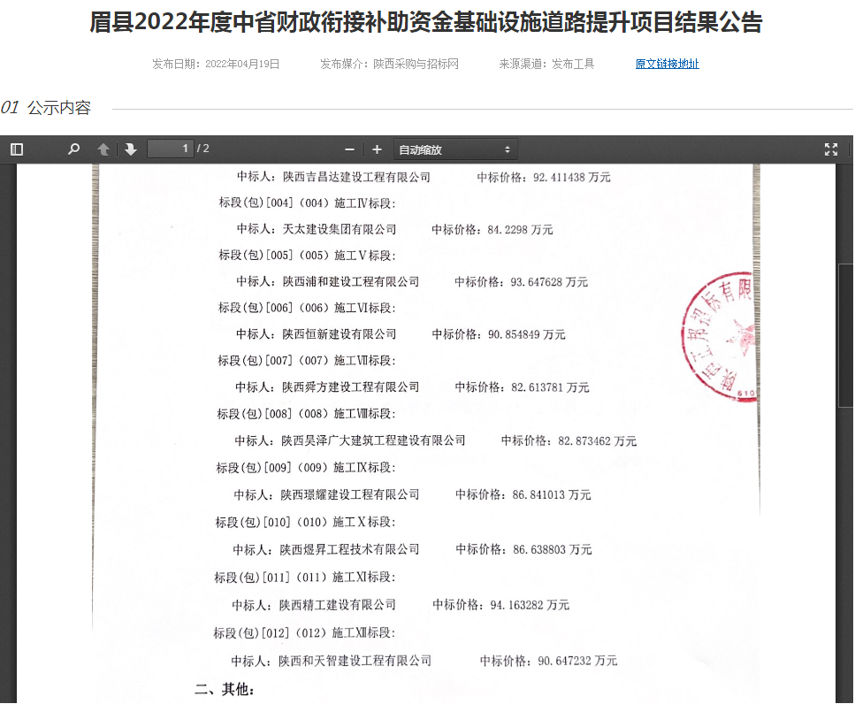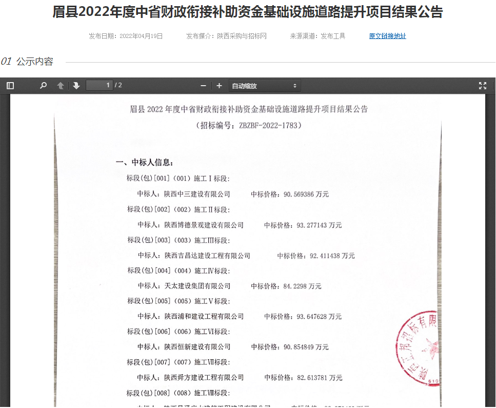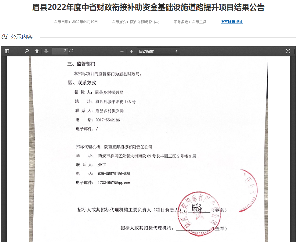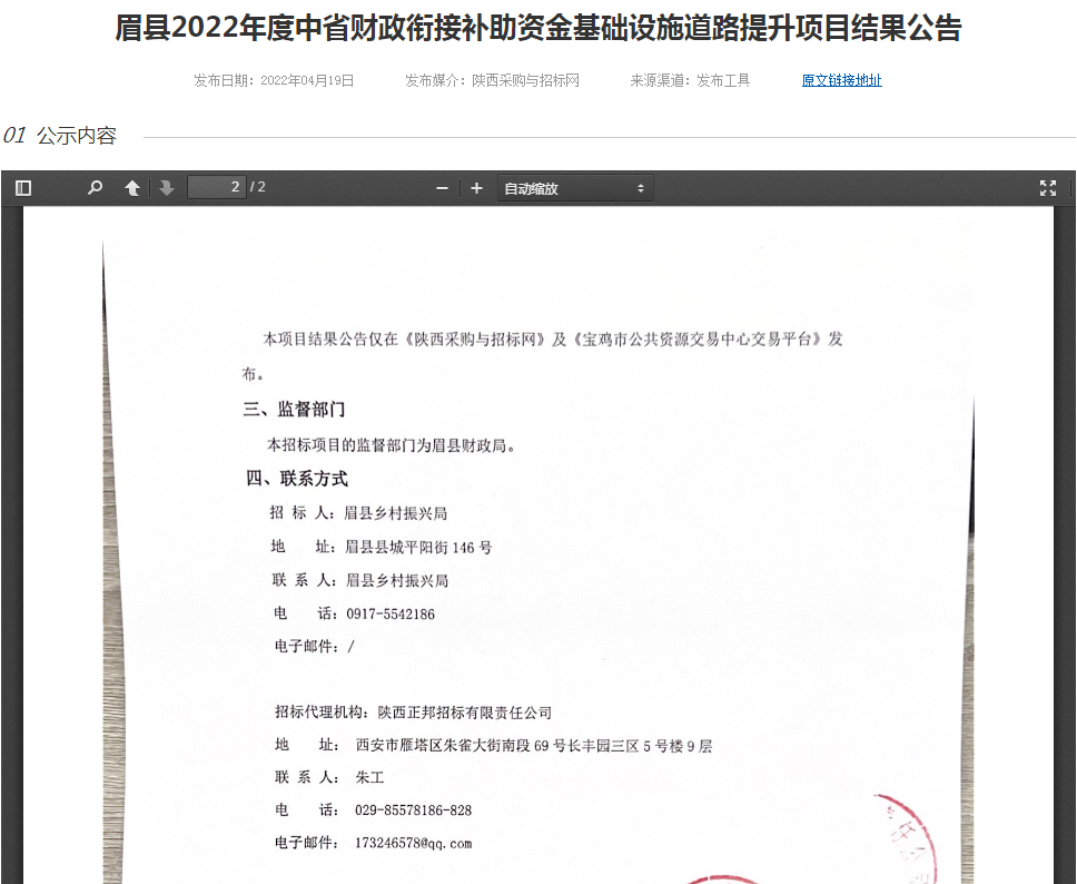眉縣2022年度中省財政銜接補助資金基礎設施道路提升項目結果公告