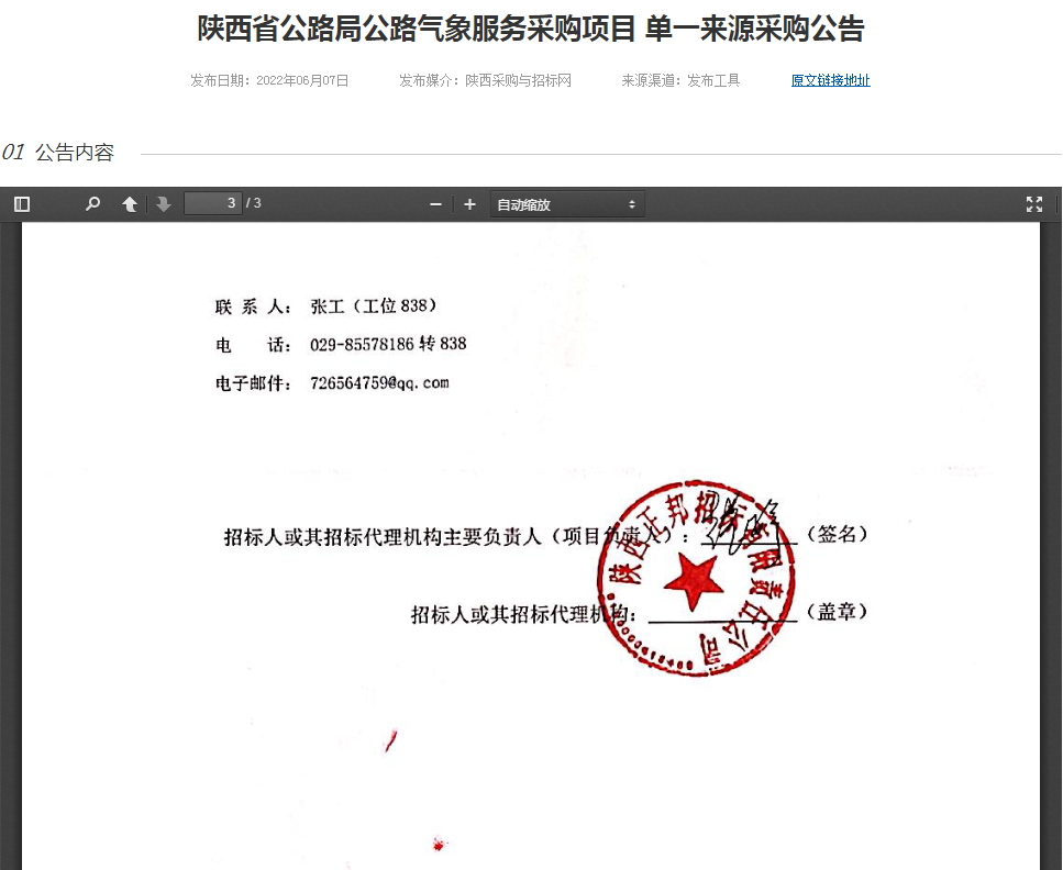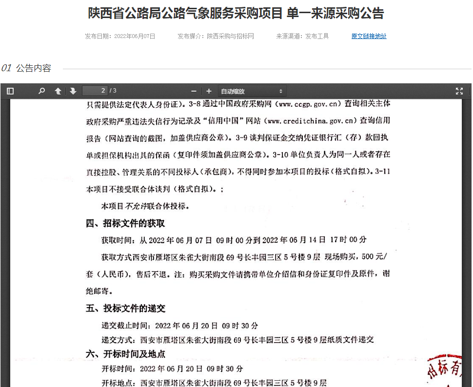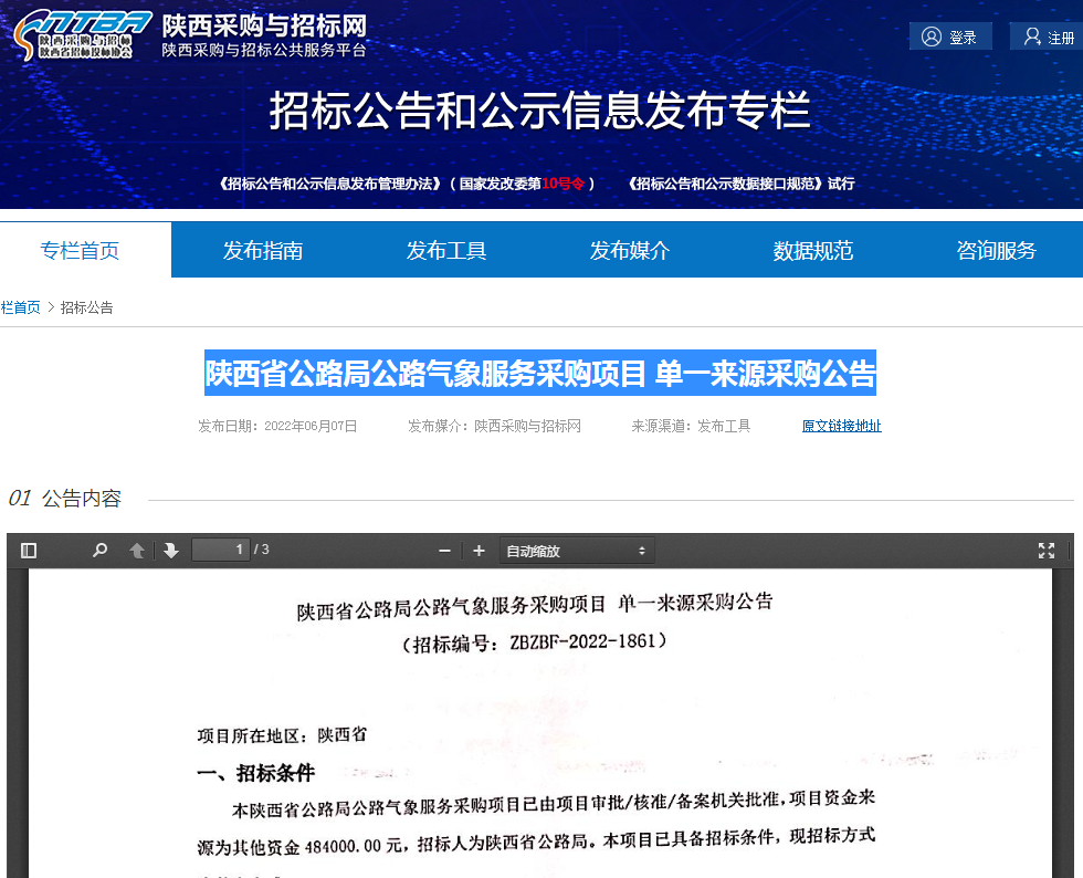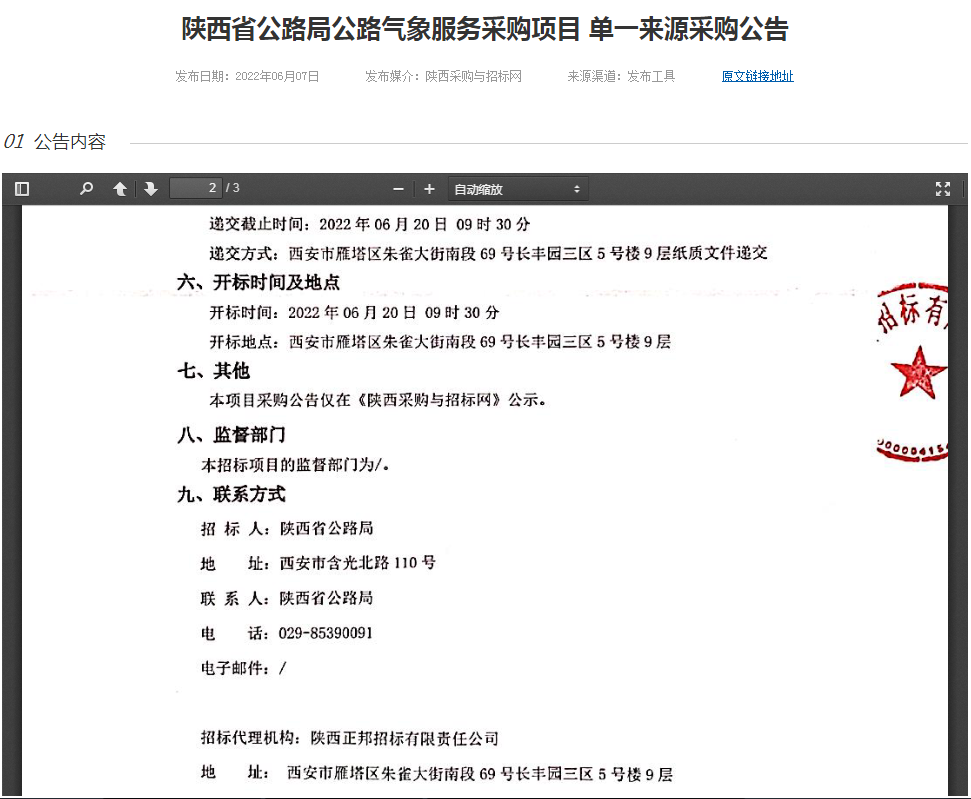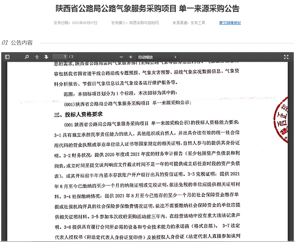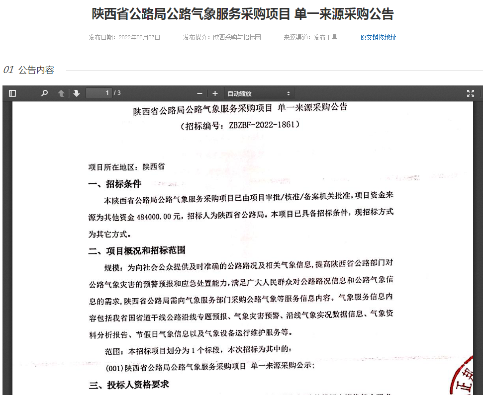 陜西省公路局公路氣象服務采購項目 單一來源采購公告