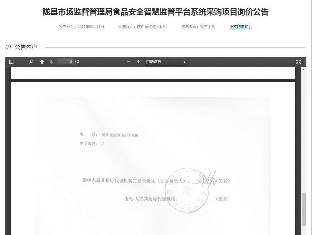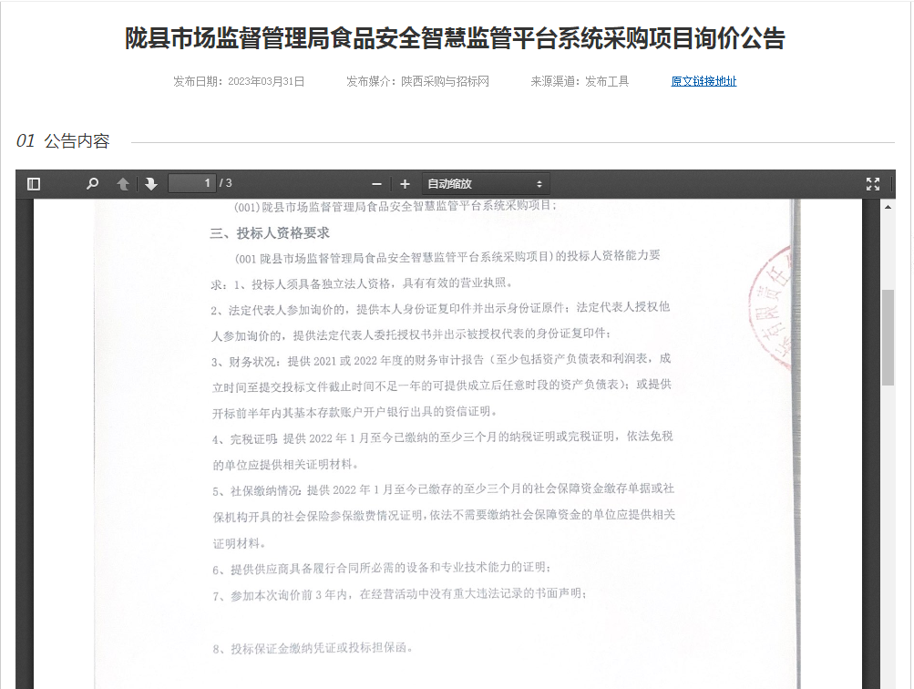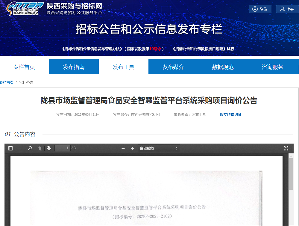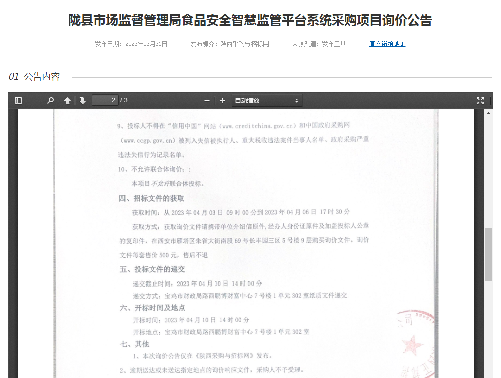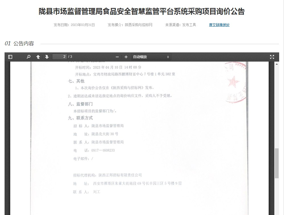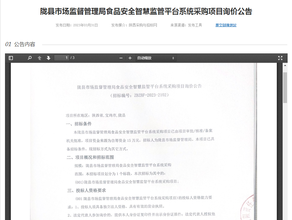 隴縣市場監督管理局食品安全智慧監管平臺系統采購項目詢價公告
