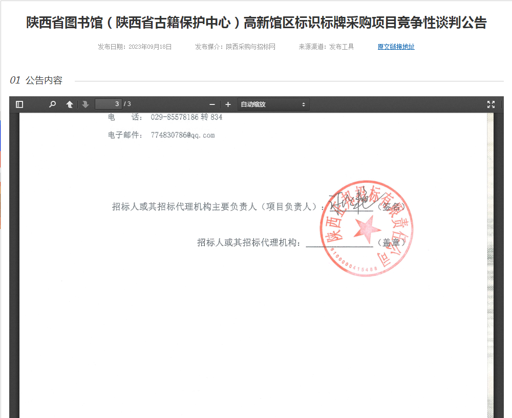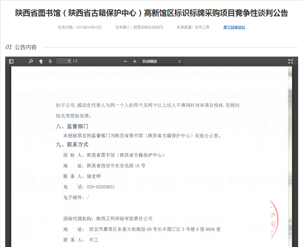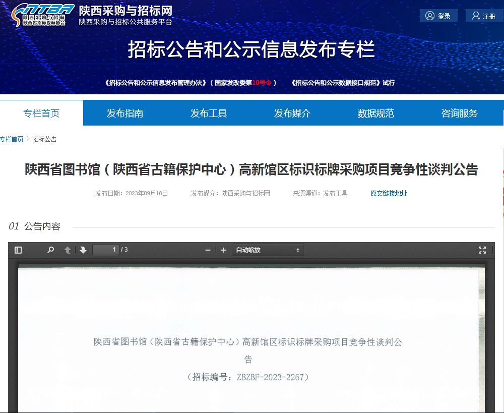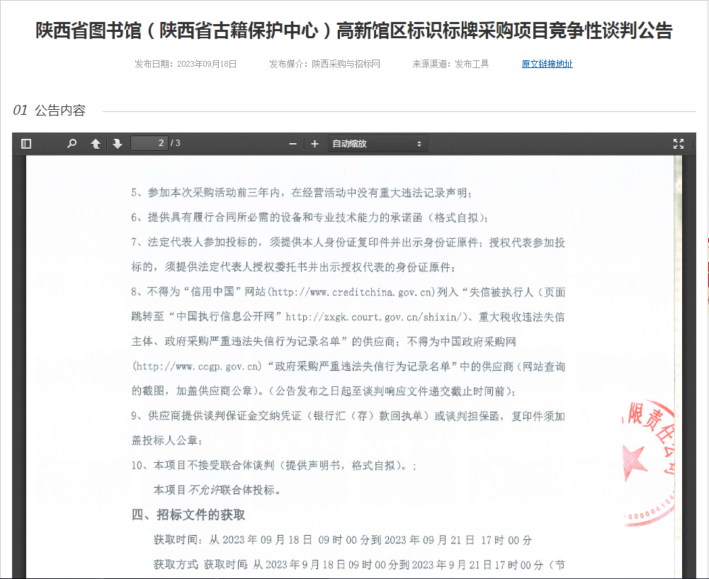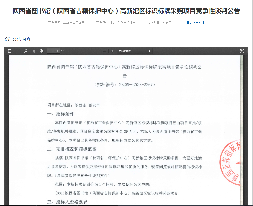 陜西省圖書館(陜西省古籍保護中心)高新館區標識標牌采購項目競爭性談判公告