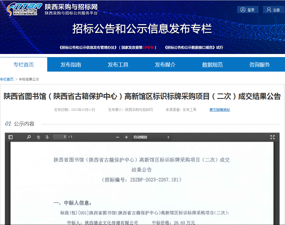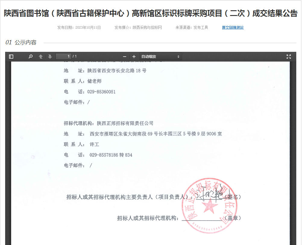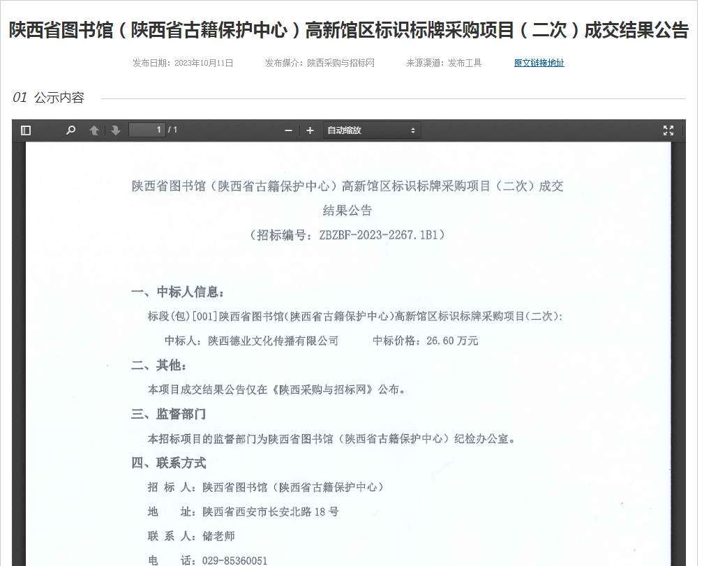 陜西省圖書館(陜西省古籍保護中心)高新館區標識標牌采購項目(二次)成交結果公告