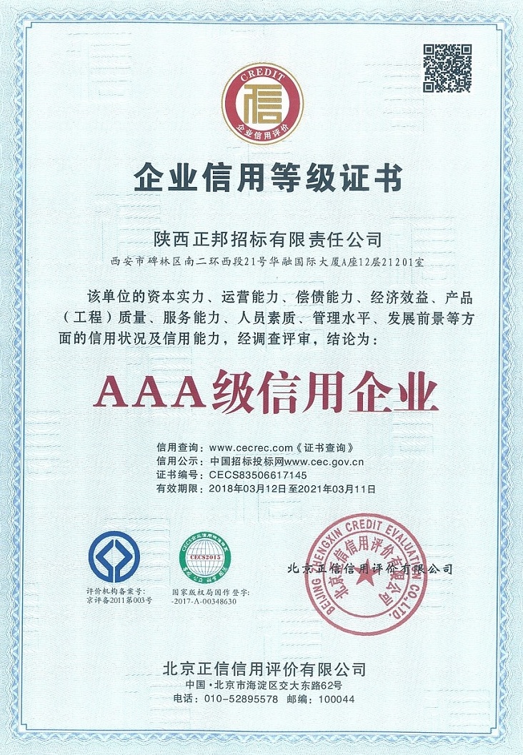 恭喜陜西正邦招標有限責任公司榮獲AAA級信用企業資質。